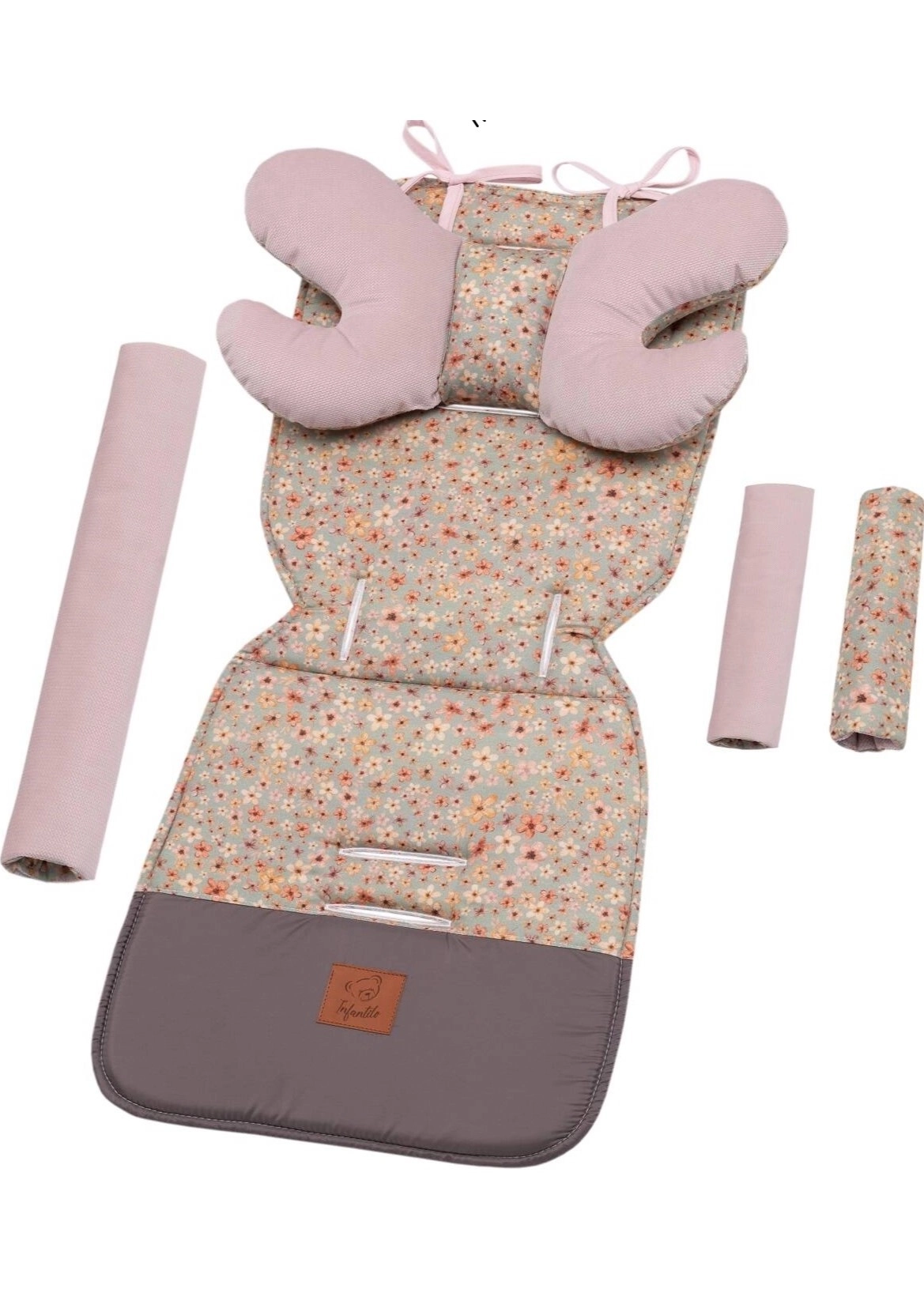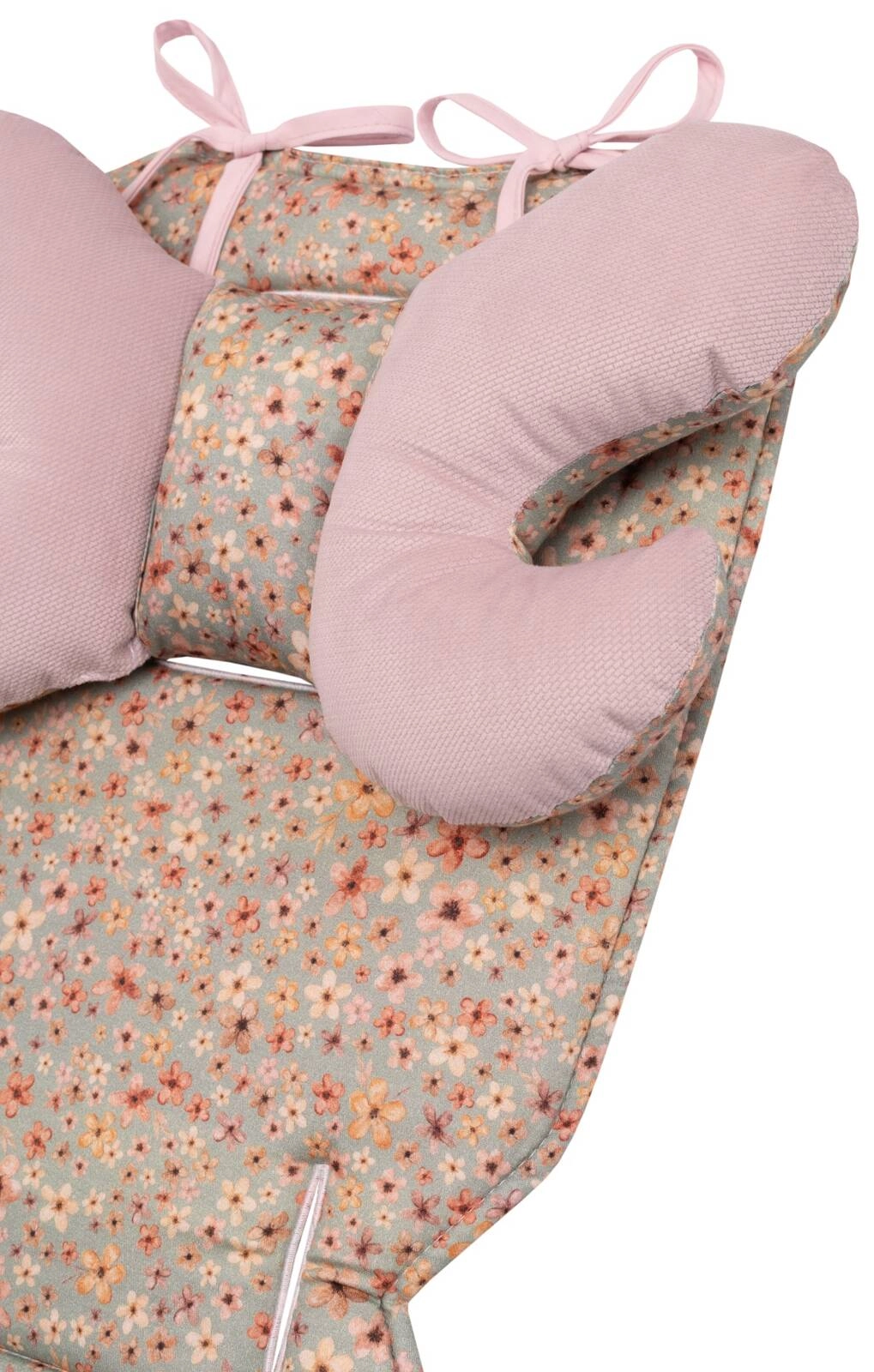 Dwustronną wkładkę do spacerówki wyposażoną w troczki do przymocowania na wózku, co zapobiega jej zsuwaniu się.