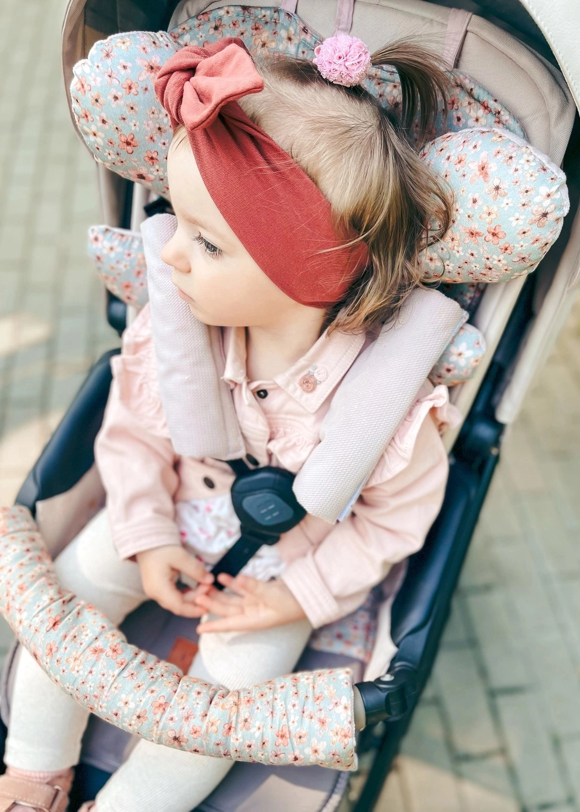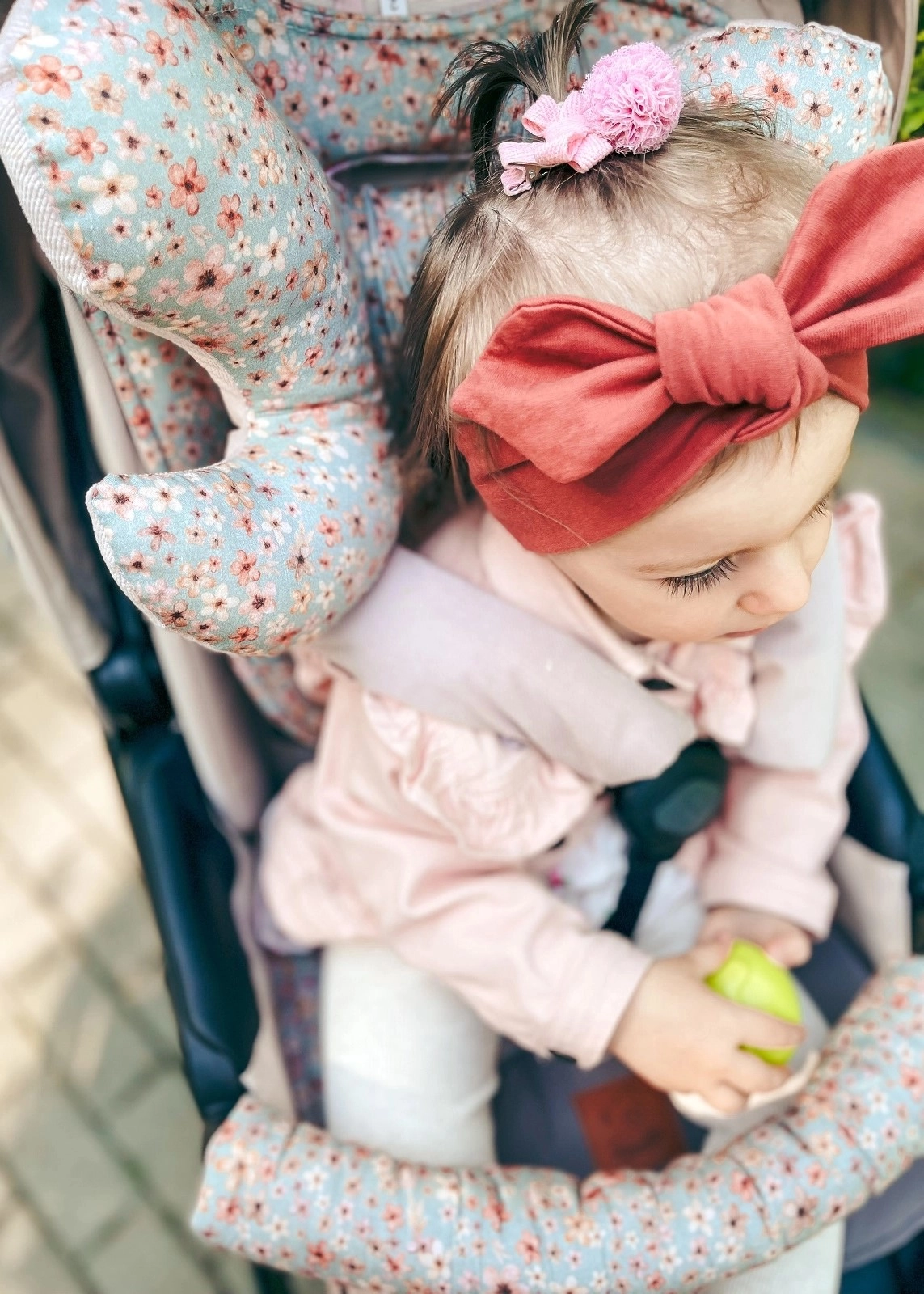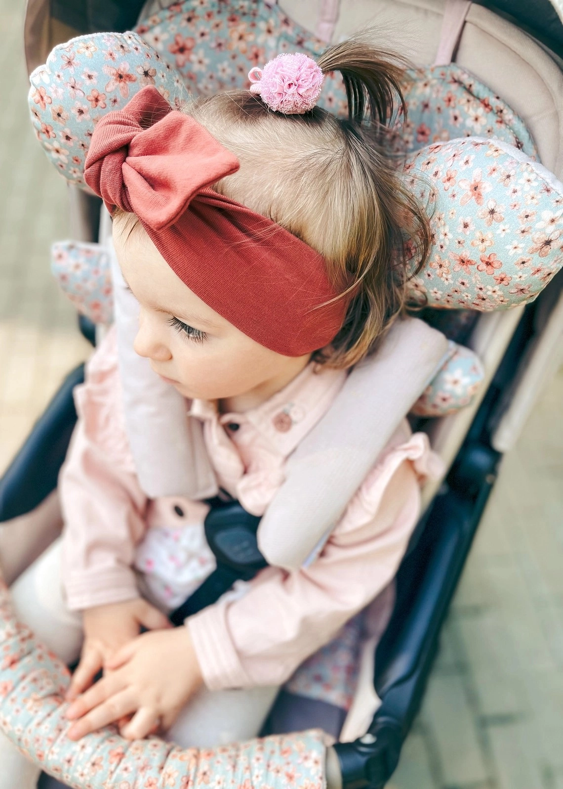 Poduszkę motylek stabilizującą główkę maluszka - Poduszka antywstrząsowa wypełniona jest delikatną, antyalergiczną kulką silikonową, która zapewnia dziecku komfort podczas siedzenia lub leżenia. Poduszkę przyczepiamy do wkładki paskiem na rzep, dzięki czemu bez problemu możemy ją odczepić.
