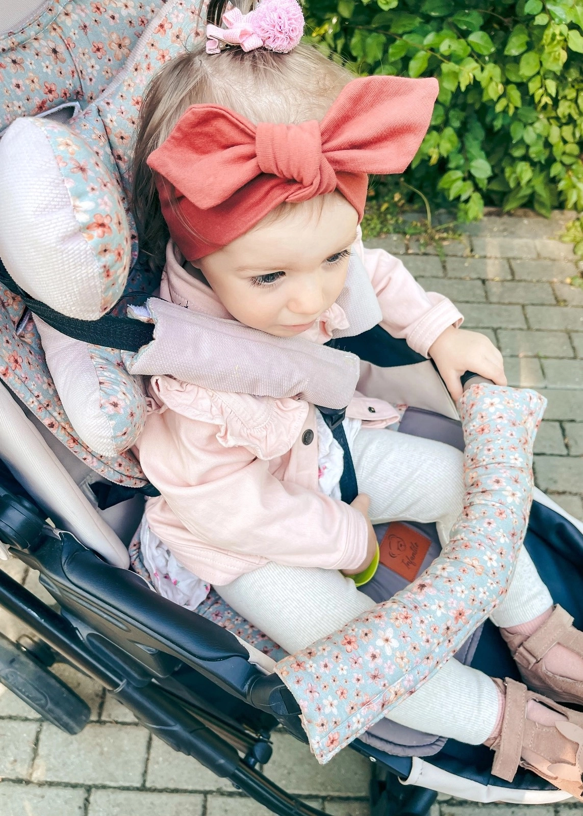 Ochraniacze na pasy i pałąk dla większego komfortu dziecka - Osłony na pasy oraz pałąk wypełnione są włókniną silikonową, dzięki czemu są wyjątkowo przyjazne dzieciom. Zapinane są na rzep, co ułatwia ich zdjęcie do prania.