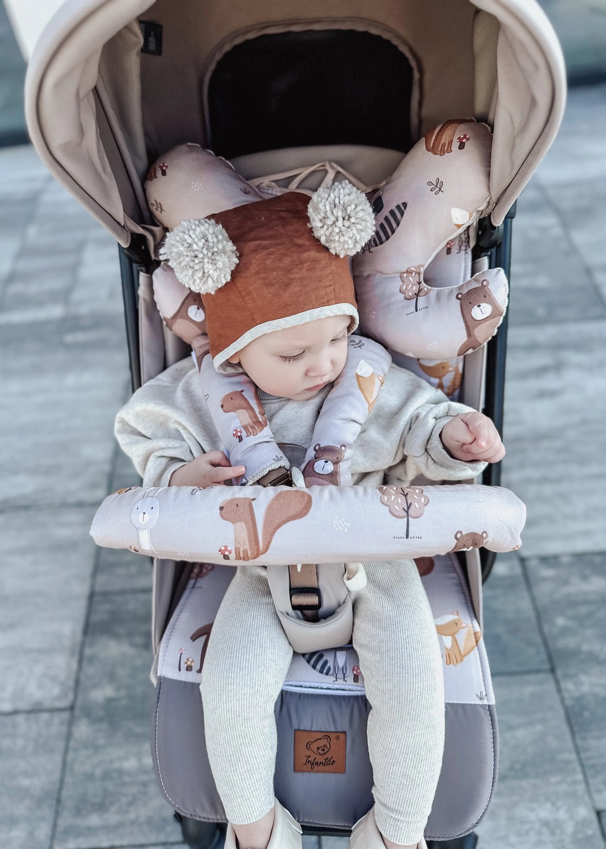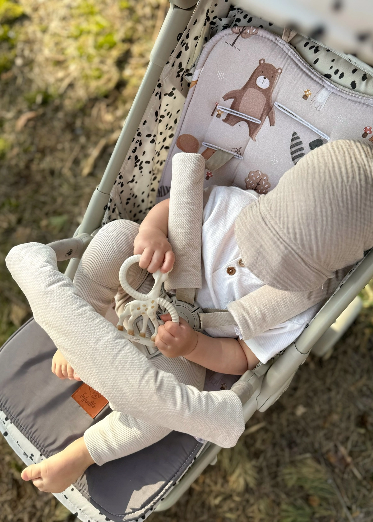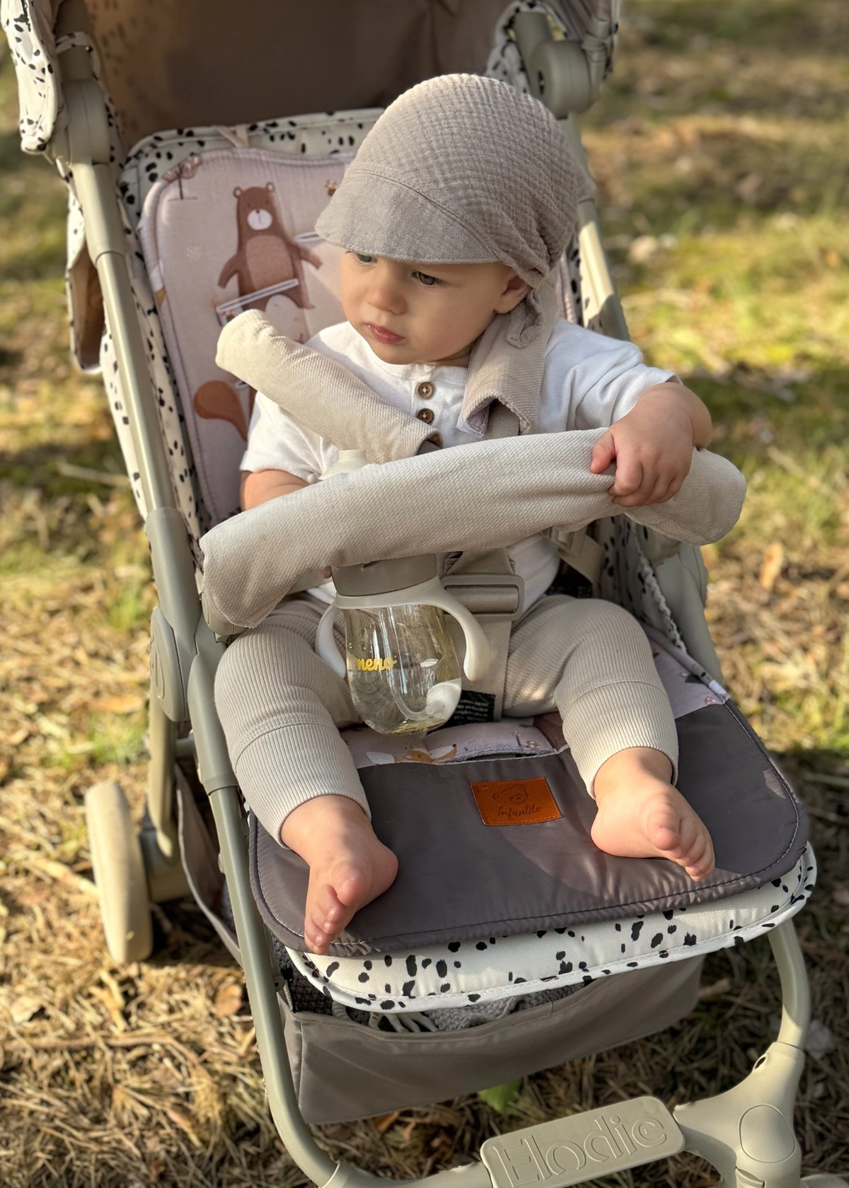 Ochraniacze na pasy i pałąk dla większego komfortu dziecka - Osłony na pasy oraz pałąk wypełnione są włókniną silikonową, dzięki czemu są wyjątkowo przyjazne dzieciom. Zapinane są na rzep, co ułatwia ich zdjęcie do prania.