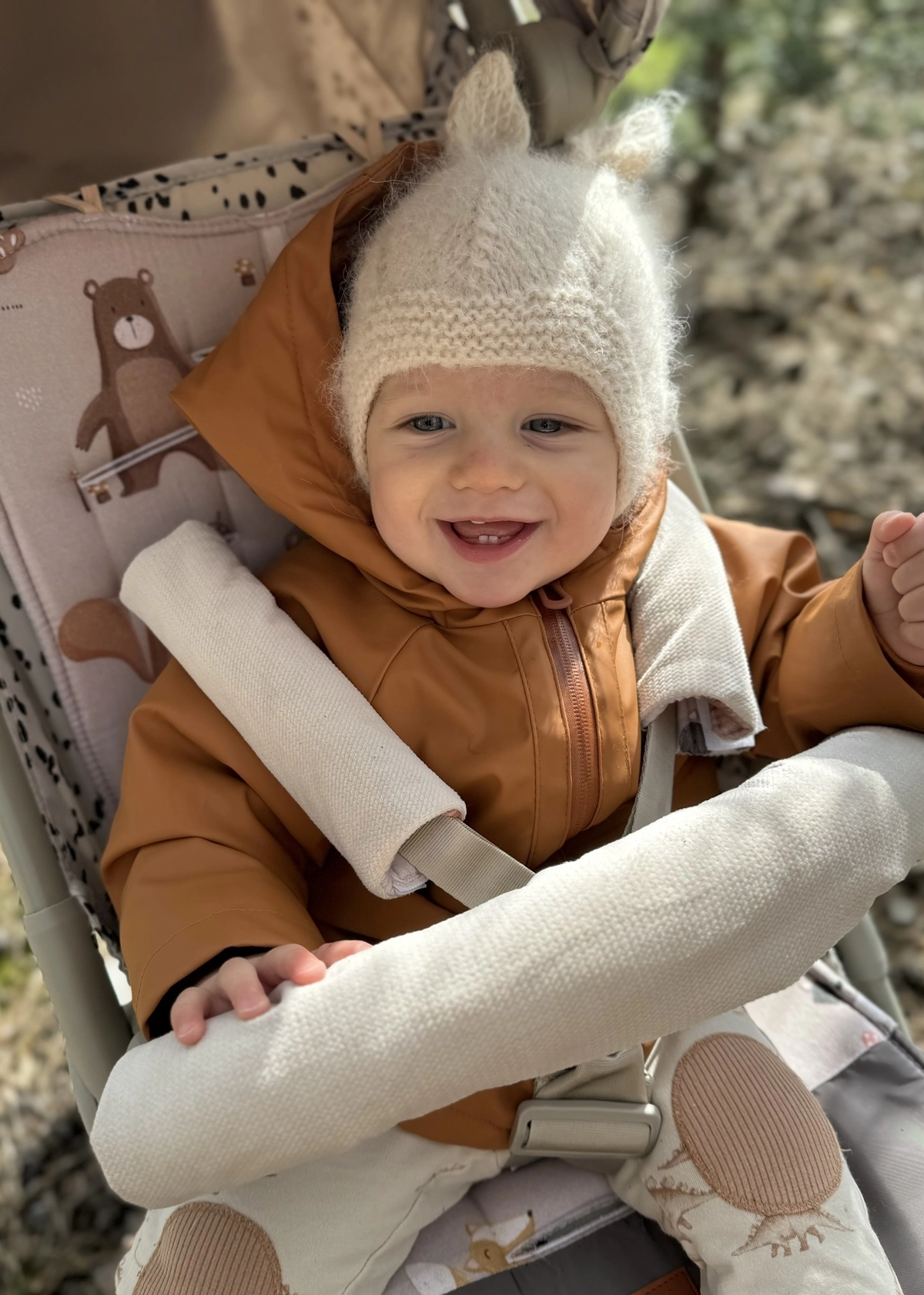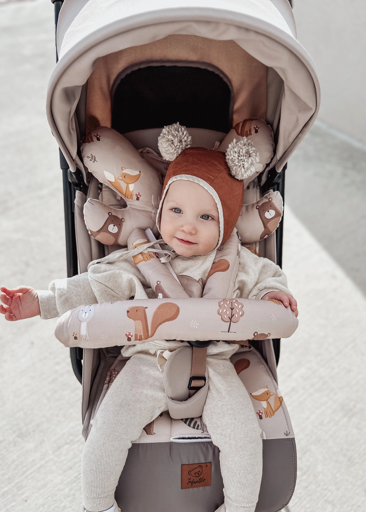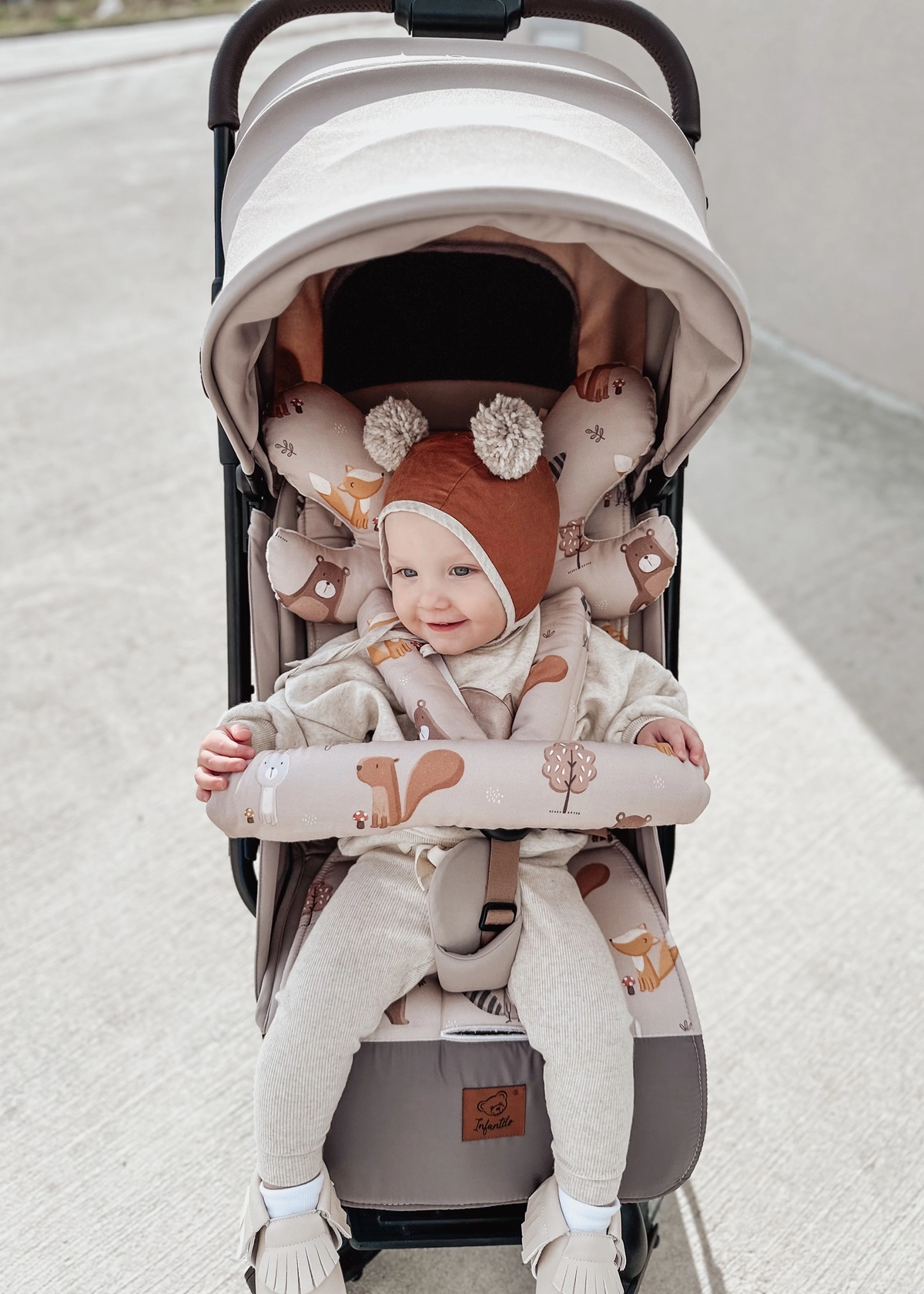 Ochraniacze na pasy i pałąk dla większego komfortu dziecka - Osłony na pasy oraz pałąk wypełnione są włókniną silikonową, dzięki czemu są wyjątkowo przyjazne dzieciom. Zapinane są na rzep, co ułatwia ich zdjęcie do prania.