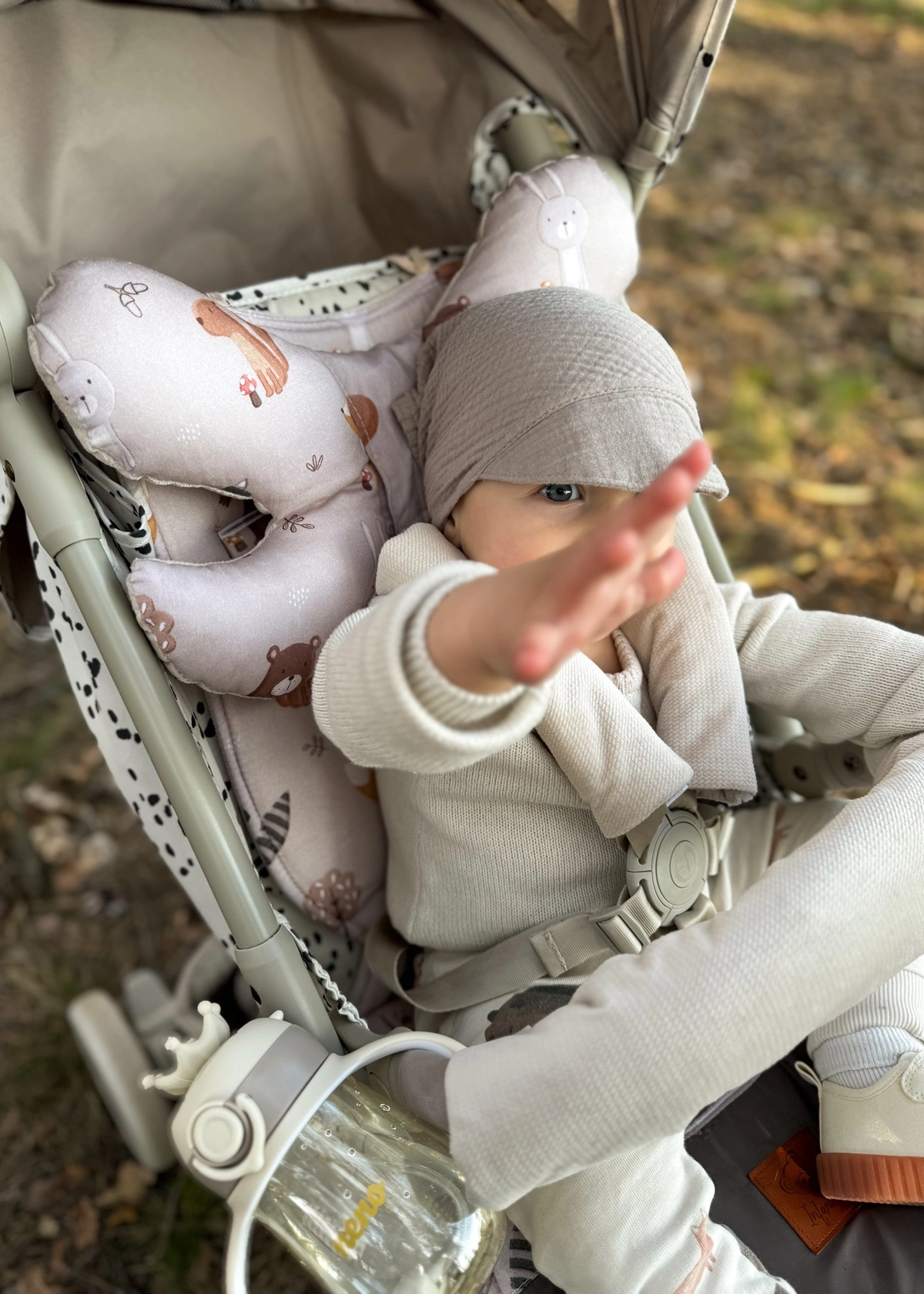 Poduszkę motylek stabilizującą główkę maluszka - Poduszka antywstrząsowa wypełniona jest delikatną, antyalergiczną kulką silikonową, która zapewnia dziecku komfort podczas siedzenia lub leżenia. Poduszkę przyczepiamy do wkładki paskiem na rzep, dzięki czemu bez problemu możemy ją odczepić.
