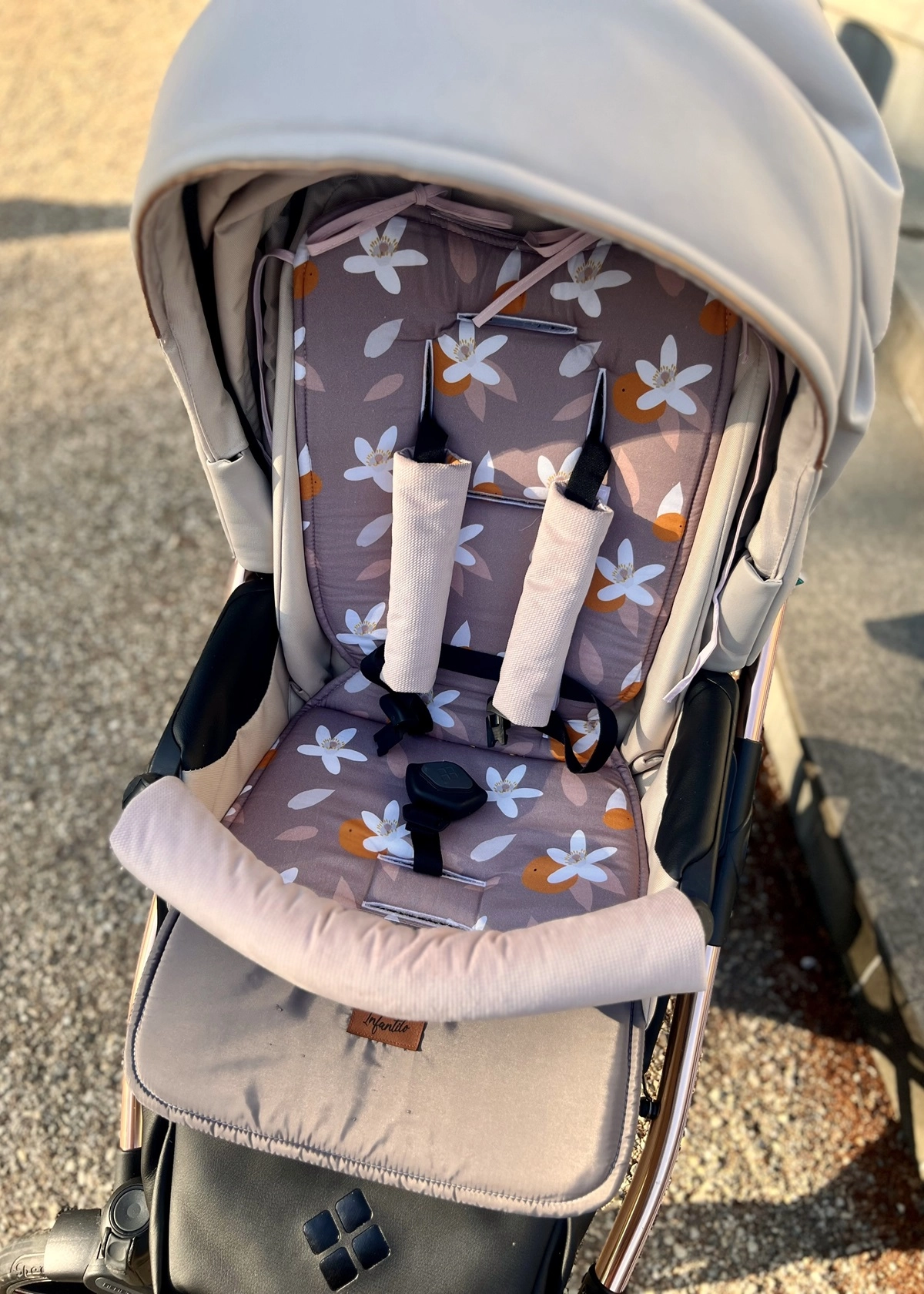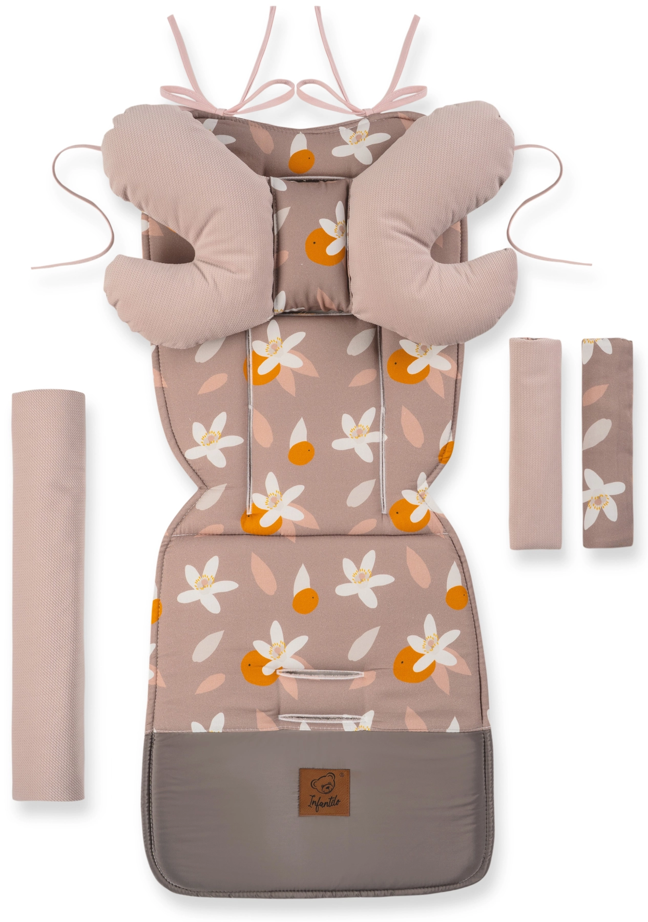 Dwustronną wkładkę do spacerówki wyposażoną w troczki do przymocowania na wózku, co zapobiega jej zsuwaniu się.